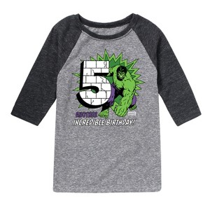 Marvel Hulk - Incredible Birthday 5 - Toddler And Youth Raglan - Introducing our collection of officially licensed Marvel graphic apparel, where legendary superheroes and iconic moments from the Marvel Universe come to life on high-quality, comfortable clothing. Each design is carefully crafted with vibrant, detailed artwork featuring beloved characters like Spider-Man, Iron Man, Captain America, and the Avengers. From bold graphic tees to stylish hoodies and accessories, our apparel celebrates the thrilling world of Marvel with cutting-edge prints, premium fabrics, and a perfect fit for fans of all ages.