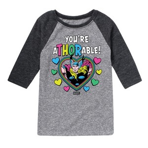 Marvel Thor - Valentine You're Athorable - Toddler And Youth Raglan - Introducing our collection of officially licensed Marvel graphic apparel, where legendary superheroes and iconic moments from the Marvel Universe come to life on high-quality, comfortable clothing. Each design is carefully crafted with vibrant, detailed artwork featuring beloved characters like Spider-Man, Iron Man, Captain America, and the Avengers. From bold graphic tees to stylish hoodies and accessories, our apparel celebrates the thrilling world of Marvel with cutting-edge prints, premium fabrics, and a perfect fit for fans of all ages.