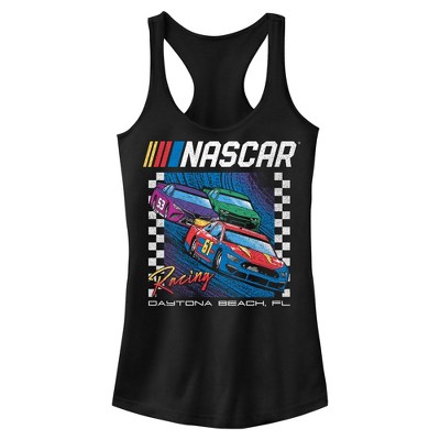 • Put the pedal to the metal on your look with this new boys' t-shirt that is perfect for race day! Featuring three colorful race cars in action, framed in a bold checkered design with the classic NASCAR logo and "Daytona Beach, FL" printed in a vintage, distressed style.