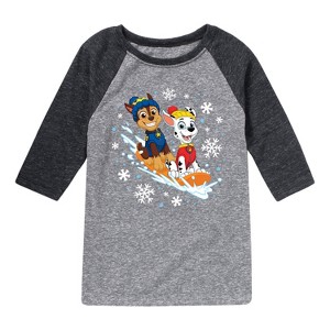 Paw Patrol - Chase Marshall Sledding - Toddler And Youth Raglan Graphic T-Shirt - Join the Paw Patrol with graphic apparel that showcases your favorite pups—Chase, Marshall, Skye, and Rubble—ready to save Adventure Bay with their heroic adventures!