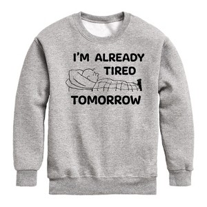 Peanuts - Tired Tomorrow - Toddler & Youth Crewneck Fleece Sweatshirt - From the best-loved comic strip in history comes officially licensed PEANUTS apparel for fans everywhere. Show your love for Charlie Brown, Snoopy, Woodstock, Lucy, Linus, Pigpen and the whole gang. Copyright Peanuts.