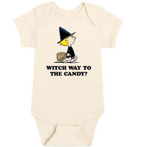 Peanuts - Witch Way To The Candy - Infant Baby One Piece - From the best-loved comic strip in history comes officially licensed PEANUTS apparel for fans everywhere. Show your love for Charlie Brown, Snoopy, Woodstock, Lucy, Linus, Pigpen and the whole gang. Copyright Peanuts.