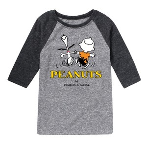 Peanuts - Charlie Snoopy Dancing - Toddler & Youth Raglan Graphic T-Shirt - From the best-loved comic strip in history comes officially licensed PEANUTS apparel for fans everywhere. Show your love for Charlie Brown, Snoopy, Woodstock, Lucy, Linus, Pigpen and the whole gang. Copyright Peanuts.