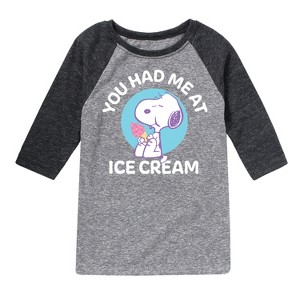 Peanuts - You Had Me At Ice Cream - Youth Raglan Tee - From the best-loved comic strip in history comes officially licensed PEANUTS apparel for fans everywhere. Show your love for Charlie Brown, Snoopy, Woodstock, Lucy, Linus, Pigpen and the whole gang. Copyright Peanuts.