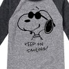 Peanuts - Cool Joe Keep On Smiling - Youth Raglan Tee - From the best-loved comic strip in history comes officially licensed PEANUTS apparel for fans everywhere. Show your love for Charlie Brown, Snoopy, Woodstock, Lucy, Linus, Pigpen and the whole gang. Copyright Peanuts.