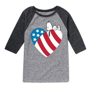 Peanuts - Snoopy On Flag Heart - Toddler & Youth Raglan Graphic T-Shirt - From the best-loved comic strip in history comes officially licensed PEANUTS apparel for fans everywhere. Show your love for Charlie Brown, Snoopy, Woodstock, Lucy, Linus, Pigpen and the whole gang. Copyright Peanuts.