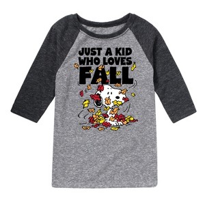 Peanuts - Just A Kid Who Loves Fall - Toddler And Youth Raglan Graphic T-Shirt - From the best-loved comic strip in history comes officially licensed PEANUTS apparel for fans everywhere. Show your love for Charlie Brown, Snoopy, Woodstock, Lucy, Linus, Pigpen and the whole gang. Copyright Peanuts.