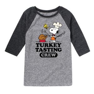 Peanuts - Turkey Tasting Crew - Toddler And Youth Raglan Graphic T-Shirt - From the best-loved comic strip in history comes officially licensed PEANUTS apparel for fans everywhere. Show your love for Charlie Brown, Snoopy, Woodstock, Lucy, Linus, Pigpen and the whole gang. Copyright Peanuts.