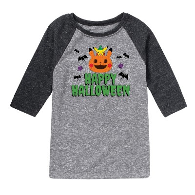 Pokémon - Happy Halloween - Youth Raglan Graphic T-Shirt - Celebrate the essence of Pokemon's Pokémon with officially licensed apparel featuring unique designs crafted exclusively by Hybrid Apparel. Each piece brings beloved characters, iconic imagery, and memorable moments to life, offering Pokémon fans a one-of-a-kind way to showcase their passion.