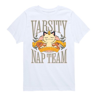 Pokémon - Meowth Varsity Nap Team -Toddler And Youth Short Sleeve Graphic T-Shirt - Celebrate the essence of Pokemon's Pokémon with officially licensed apparel featuring unique designs crafted exclusively by Hybrid Apparel. Each piece brings beloved characters, iconic imagery, and memorable moments to life, offering Pokémon fans a one-of-a-kind way to showcase their passion.