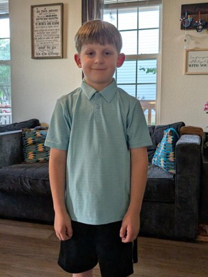 Polo T-shirt in a solid shade with textured stripes. Designed with a collared neckline, two-button placket front and short sleeves for a classic look. Crafted from a midweight knit fabric blend of recycled polyester, rayon and spandex for flexible wear that moves and stretches with your child. Boasts quick-drying and moisture-wicking properties to keep them cool and fresh during outdoor adventures. Tailored in an athletic fit that hits below the waist for wearing tucked or untucked. Side vents complete the design with an airy feel.