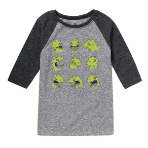 Rugrats - Reptar Heads - Toddler And Youth Raglan Graphic T-Shirt - Embark on a nostalgic adventure with the Rugrats graphic apparel collection! Showcasing beloved characters like Tommy, Chuckie, Angelica, Phil, Lil, and more, each design captures the playful spirit and imagination of the iconic animated series. Perfect for fans of all ages, these pieces bring childhood memories to life with fun, colorful style.