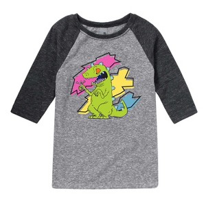 Rugrats - Reptar Shreds - Toddler And Youth Girls Raglan Graphic T-Shirt - Embark on a nostalgic adventure with the Rugrats graphic apparel collection! Showcasing beloved characters like Tommy, Chuckie, Angelica, Phil, Lil, and more, each design captures the playful spirit and imagination of the iconic animated series. Perfect for fans of all ages, these pieces bring childhood memories to life with fun, colorful style.