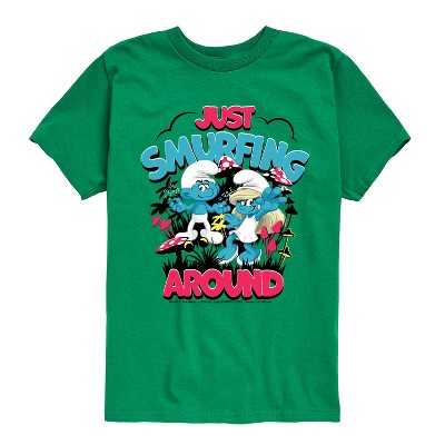 Smurfs - Just Smurfing Around - Kids Youth Short Sleeve Tee - Step into a whimsical world with graphic apparel inspired by The Smurfs! Featuring classic characters like Papa Smurf, Smurfette, Brainy, and the whole blue crew, these playful designs capture the charm and fun of the beloved animated series. With bright colors and nostalgic flair, this collection is perfect for fans of all ages.
