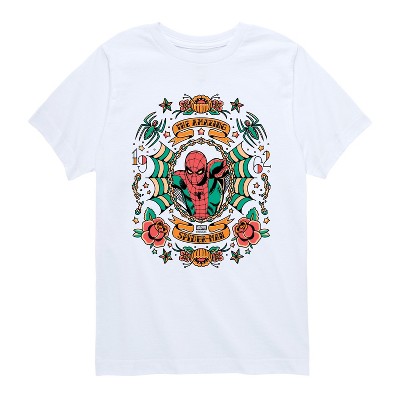 Spider-Man - Floral Tats - Youth Boys Long Sleeve Graphic T-Shirt - Swing into action with our officially licensed Spider-Man graphic apparel collection! Inspired by the legendary web-slinger, this collection features bold, dynamic designs that celebrate Spider-Man’s iconic red and blue suit, his web-slinging adventures, and unforgettable moments from both the comics and films. With striking artwork showcasing Spider-Man’s agility, sense of humor, and unwavering dedication to protecting New York City, each piece captures the essence of Peter Parker's heroic journey. From graphic tees and hoodies to accessories, this collection combines comfort and style, letting you represent one of Marvel's most beloved heroes.