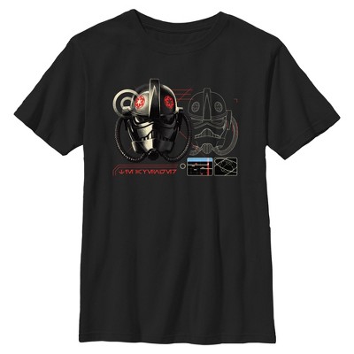 Command attention with this stylish new boys' t-shirt that is perfect for those epic binge-watching sessions! Featuring the helmet of a TIE Fighter pilot, along with a cool schematic design and vibrant red Aurebesh letters displayed below.