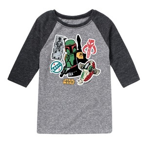 Star Wars - Boba Fett Stickers - Toddler And Youth Raglan - Embark on an epic adventure with our officially licensed Star Wars graphic apparel collection! Celebrate the legendary saga with bold, iconic designs featuring your favorite characters, ships, and moments from a galaxy far, far away. Whether it's the fearless Luke Skywalker, the powerful Darth Vader, the wise Yoda, or the unforgettable Millennium Falcon, each piece captures the magic and excitement of the Star Wars universe. From graphic tees and hoodies to sweatshirts, this collection combines comfort with striking artwork that showcases the timeless appeal of the Star Wars story.