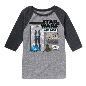 Star Wars - Han Solo Action Figure - Toddler And Youth Raglan - Embark on an epic adventure with our officially licensed Star Wars graphic apparel collection! Celebrate the legendary saga with bold, iconic designs featuring your favorite characters, ships, and moments from a galaxy far, far away. Whether it's the fearless Luke Skywalker, the powerful Darth Vader, the wise Yoda, or the unforgettable Millennium Falcon, each piece captures the magic and excitement of the Star Wars universe. From graphic tees and hoodies to sweatshirts, this collection combines comfort with striking artwork that showcases the timeless appeal of the Star Wars story.