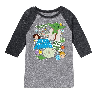 Star Wars - Yoda Stickers - Toddler And Youth Raglan - Embark on an epic adventure with our officially licensed Star Wars graphic apparel collection! Celebrate the legendary saga with bold, iconic designs featuring your favorite characters, ships, and moments from a galaxy far, far away. Whether it's the fearless Luke Skywalker, the powerful Darth Vader, the wise Yoda, or the unforgettable Millennium Falcon, each piece captures the magic and excitement of the Star Wars universe. From graphic tees and hoodies to sweatshirts, this collection combines comfort with striking artwork that showcases the timeless appeal of the Star Wars story.