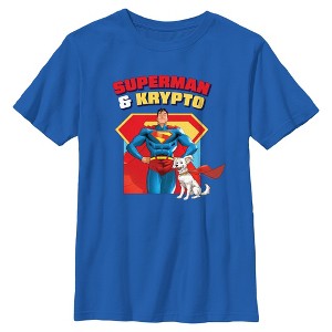 Show off your super side with this officially licensed Boys' DC Comics Superman Krypto Duo Graphic T-Shirt! Featuring charming cartoon versions of Superman and his trusty sidekick Krypto standing tall, along with the iconic "S" symbol in the background and their names above them. Perfect for true fans and superhero lovers alike, it's a must-have for anyone ready to wear their fandom proudly. Don't just follow the pack, lead it with this heroic, eye-catching shirt that's sure to turn heads and steal hearts!