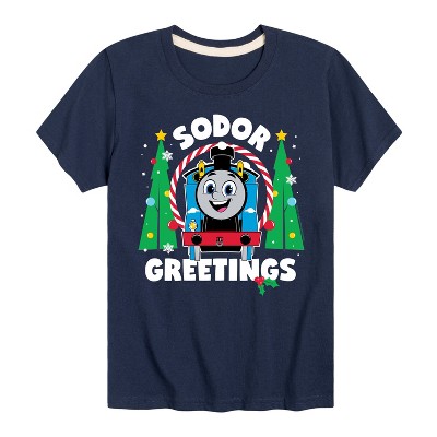 Thomas & Friends - Happy Holidays Thomas - Youth and Toddler Short Sleeve Graphic T-Shirt - All aboard for fun with Thomas & Friends graphic apparel! Featuring Thomas the Tank Engine, Percy, and James, these cheerful designs are perfect for fans of the Island of Sodor and its friendly locomotives.