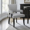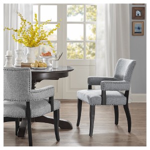 Update your dining room decor with the Bracken Dining Chair. The open back and armrest creates a unique styling. The chair features an upholstered fabric with nail head accents. To further elevate the look, the chair stands on long curved wooden legs in noir finish. Assembly required.