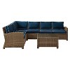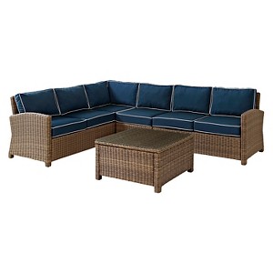 Create a perfect, relaxing ambience in your backyard or patio with this Bradenton Five-Piece Wicker Outdoor Conversation Set from Crosley. Constructed from intricately woven wicker over durable steel frames, this outdoor sofa set personifies ultimate comfort with style and durability. Its modular design lets you explore your interior designing skills with full flexibility, allowing you to easily add or remove sections as needed to fit your space. The navy seat and back cushions are UV- and fade-resistant, keeping them good as new use after use, and the addition of a coffee table makes the set a great place to lounge, enjoy meals and one another's company.