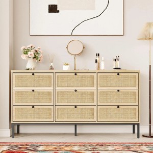 Premium Material & Sturdy and Durable: This 9-drawer dresser is made of environmental material, the drawer door is made of natural rattan with round metal knobs. This material is safe and environmentally friendly, ensuring no peculiar smell. The sturdy steel bottom with steel legs is very strong, making the dresser stronger in load-bearing capacity and not easily deformed