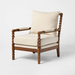 Transform your seating space with this Braided Accent Chair from Threshold™ designed with Studio McGee. This upholstered armchair has a cushioned seat and backrest in a textured cream color for comfy seating and easy blending with existing decor. It’s paired with a brown wooden frame and features a stylish braided design. Place it in your bedroom, living room or study to sit back and relax in comfort.