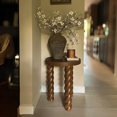 Bring vintage charm to your home decor with this Braided Accent Table from Threshold™ designed with Studio McGee. Supported on a wooden frame, this accent table features a round tabletop to place a variety of decor items and boasts three braided legs that add a touch of timeless elegance. Plus, the table is designed in a walnut hue for easy integration with existing room decor.