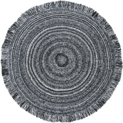 Transform any space with the sophisticated charm of our handwoven, 5' X 5' round area rug. The balanced black and grey hues paired with our timeless braided design bring a touch of elegance and versatility to your indoor and outdoor settings. Crafted from premium polypropylene in China, this durable rug sports a low profile with a 1/4" pile height, combining form and function for high-traffic areas.