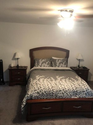 I love the simple, clean design of this comforter. So many comforter designs have a busy pattern and don't fit the "relaxing" look I wanted for our room. It's a great shade of medium gray with stark white flowers. The width works well for us too. Again, many comforters are not wide enough and don't come down far enough on the sides, but this one is great. For reference, we have a 9" mattress and no box springs on a platform bed.