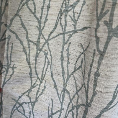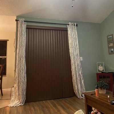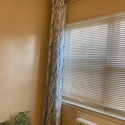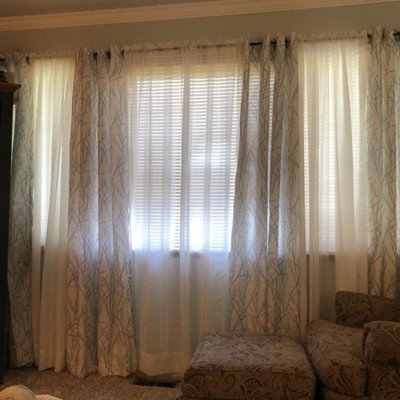 Purchased the sea foam color for our lake home. Tons of windows in this room. Wanted something that would lighten the room, but still filter out enough light when we watch TV. The branches add a nice detail. In the pic the blinds on the left are up, but down on the right so you can see the difference with the curtains drawn.