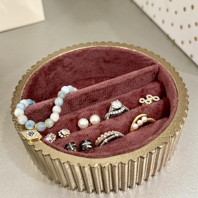 Keep your precious jewelry secured with this Brass Jewelry Tray from Hearth & Hand™ with Magnolia. This circular tray is designed in a brass finish and features a ribbed design that adds a textured look to your dressing table. Made of metal, this tray features two compartments and boasts a velvet lining to securely hold your earrings, rings, pendants, and other small pieces of jewelry.