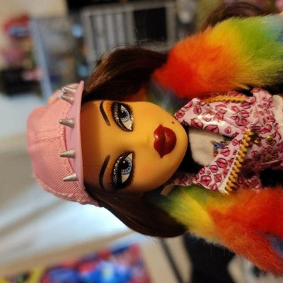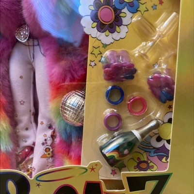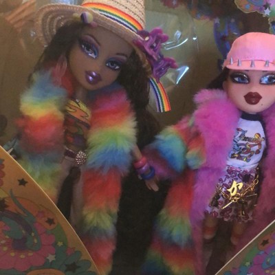 - OUT & PROUD FASHIONS & ACCESSORIES: Roxxi™ & Nevra™ are in their loudest and proudest Pride parade looks! Roxxi™ wears a 2-piece jacket and skirt with JimmyPaul tie front ringer tee underneath, rainbow faux fur boa, LGBTQ+ buttons on her hat and skirt, socks and a gold chain belt with Bratz® letter charms. Nevra™ wears an a-symmetrical glitter top, flared pants with printed Bratz® graphics, a full-length faux fur rainbow coat, LGBTQ+ buttons on her hat, female symbol earrings, and shoes adorned with the Progress flag.