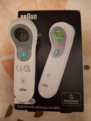 [This review was collected as part of a promotion.] This thermometer is great! Requires batteries but includes two to start you off. Clear diagram of where to point the thermometer (after removing the cap). Seemed to be accurate since I took my temperature three times. It isn't too loud which is good when taking the temperature of a sleepy sick baby. Braun is a brand you can trust and I am happy to have this product in my repertoire on tough sick days. I also checked against another thermometer and got the same temperature. I would recommend this for use for newborns, children or adults! This product was gifted in exchange for my honest review.