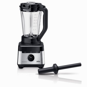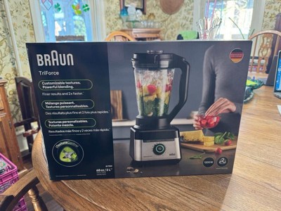 The latest Braun TriForce Power Blender will be a staple in your kitchen for an effortless personalized blending experience. It features a TriAction technology jug, designed with a triangular shape. This sophisticated engineering guarantees 60% finer and 2x faster blending*. The seamless interface makes it easy to quickly master recipes thanks to the iTextureControl functionality. Simply select any one of the 3 automated programs to start – Smoothie, Ice Crush or Chop, then choose between one of 3 unique texture settings – smooth, medium, or coarse - for 9 possible blends as precise as your palate. The blender’s innovative technology is supported by 1200 watts of continuous power and premium stainless steel blades. The sharp PrecisionEdge Blades effortlessly emulsify the toughest ingredients like hearty root vegetables and dense chunks of ice, ensuring everything from silky smoothies to savory spreads is equally enjoyable; while the durable motor system also offers 10 manual speed settings plus a pulse function to bring every foodie craving to fruition. The easy-to-use control panel is a simple wipe clean surface when you’re finished. Clean up is quick with a dedicated auto-clean program. With the included 3 year warranty, it’s easy to see why the innovative Braun TriForce Power Blender is the accomplished culinary sidekick your kitchen’s been searching for. *Compared to the Braun JB7201.