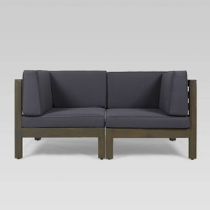 Featuring cross-back acacia wood frames and weather-resistant outdoor cushioning, this Christopher Knight Home Brava 2pc Acacia Modular Loveseat will add a luxe, resort-like flair to any outdoor living area it finds itself a part of. Two single-armed components come included, one for the left side and one for the right, forming a seating arrangement comparable to a conventional loveseat when joined at their unarmed ends. The set is completely configurable, able to round out any outdoor living area, whether together, apart, or as an accompaniment to a larger ensemble of sectional outdoor furniture. For the patio, deck, porch, or yard of modest proportion.