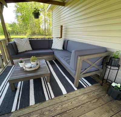 MID-CENTURY MODERN: Our sofa set offers a mid-century modern look to your patio space with its clean lines and understated look. Featuring traditional slatted seating and a cross-back wooden frame, this set upgrades this classic style with its smooth texture and fresh cushion colors.