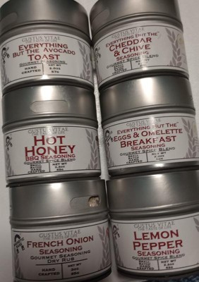 - Lemon Pepper Seasoning: Sea Salt, Garlic, Onion, Black Pepper, Lemon Zest, Thyme, Oregano, Rosemary, Marjoram.