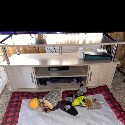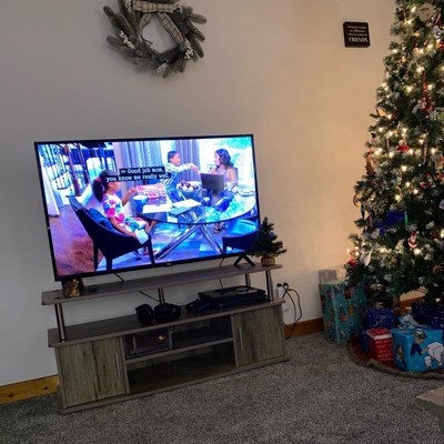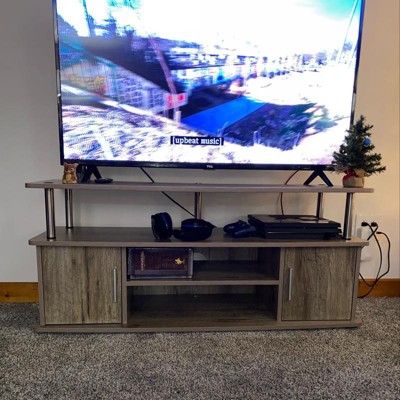 Transform your entertainment space with the Designs2Go Monterey TV Stand with Cabinets and Shelves by Breighton Home. Expertly crafted to hold TVs up to 55 inches, this stand effortlessly combines contemporary design with practical functionality, creating a sophisticated entertainment centerpiece for any room. With a combination of open shelves and spacious cabinets, it’s easy to store and organize all your media essentials while maintaining a tidy appearance. Each of the two bottom shelves features conveniently placed cable management holes to ensure that cords stay neatly tucked away for a clutter-free appearance. The stand’s rich woodgrain finish, sturdy manufactured wood build, and rust-resistant stainless steel poles add a touch of elegance and promise long-lasting durability. With easy assembly and instructions provided, the Monterey TV Stand with Cabinets and Shelves is the ideal addition to any living room or home theater.