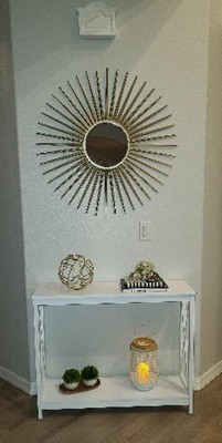 SO GLAD I GOT THIS! I have been looking for a console table for a while and couldn’t seem to find one that both fit my budget and matched the furniture I already had, until I found this one! I had this on notification so when it came back in stock I would be alerted and as soon as it came back in stock it went on sale so I purchased it. Upon arrival I had my husband set it up and by hisself he took maybe 30 mins putting it together. once he had it all put together it was very sturdy, it works perfectly where I wanted it and looks absolutely beautiful. If you’re looking for a console table and considering this one, I would highly recommend it. I am definitely pleased with this purchase! The other reason I wanted to get a console table in the first place was because I wanted baskets to be able to toss shoes into, and this has 100% made tidying up our footwear easier, a bonus for us moms!