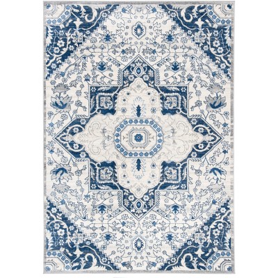 The rug's stunning traditional style comes to life through its intricate pattern, displaying ornate floral details and classic motifs in a striking navy and light grey color palette. This captivating design is not dependent on size and translates beautifully in this 6' X 9' configuration.