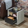 Modern entertaining calls for nuanced vibes that reflect on style and add function. Designed with a cozy cement-like frame the 24/7 Shop At Home Briggin Industrial End Table in Black by 24/7 Shop At Home is a wonderfully unique creation. The drawer conveniently slides open for enclosed storage and the top shelf features an open design so you can see your belongings. Store remotes, books, and more in the multiple compartments and enjoy the charm and practicality of this piece.