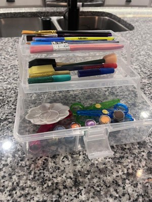 [This review was collected as part of a promotion.] This is a neat little box. I like that it’s clear so you can see what’s inside and it has 2 trays and a larger bottom space. It looks pretty small but surprisingly can hold quite a few items. Perfect length for paintbrushes.
