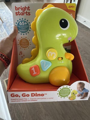Countdown to a crawling chase in 3, 2, 1. GO! The Go, Go Dino musical light-up dinosaur toy from Bright Starts rolls around to encourage baby to get movin. When youve caught up to this dinosaur toy, discover numbers, colors and shapes with easy to push buttons. Just a tap of the nose will activate music, lights, motion and silly sounds. Get ready to T-Rex & ROLL!