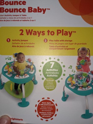 BOING! Get ready for bouncy, jumpy fun with the Bounce Bounce Baby 2-in-1 Activity Jumper & Table from Bright Starts. Youll get years of use out of this grow-with-me jumper by converting it into a standing activity table for toddler play (pssst theres a toy storage bag included, too!). In jumper mode, our 3-position height adjustable bouncy pad lets baby jump for joy at just the right height. The seat pad rotates 360 for easy access to all the toys and activities. The electronic frog toy station makes playful ribbit sounds and plays music, with light-up lily pads to delight your babys eyes and ears. As baby grows, remove the bouncy pad and create a standing play table. Easily swap out the baby seat for our toy storage bag to help keep play sessions tidy and your toddlers favorite toys within reach. Babies and toddlers will love the 7 interactive toys in this Playful Pond fashion, like the dragonfly spinner and snail self-discovery mirror. With a space-saving pondscape packed with activities, entertaining your growing kiddo is just a walk in the park!