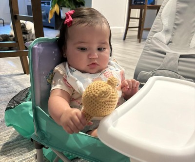 - Safety features include 3-point harness and straps for attaching to adult chair