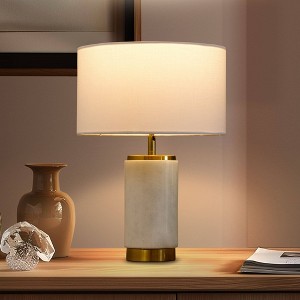 this table lamp looks elegant with marble base and warm glow, a perfect decor addition