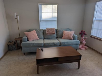 This fits in my small, crowded space. Provides good task lighting and room lighting for my dark room. Very pleased with it. Easy assembly. Touch spot for three levels of light easy to reach. (Floor switch would not have worked for this space.)